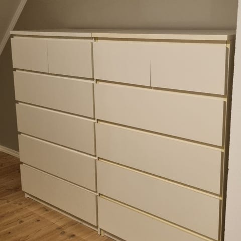 Malm kommode med 6 skuffer, bunnplate i nesten alle skuffene har dottet ut av hakke sitt, men ingenting som går utover bruken. Ikke noe problem å legge ting med vekt i skuffene som den er nå.