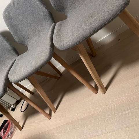 Stolen er trukket i mørkgrått stoff, med lysegrå detaljer på sidene som gir et eksklusivt og tidløst uttrykk. Bena er laget av oljebehandlet massiv eik, noe som gir både solid kvalitet og et naturlig, varmt preg. Praktisk fotstøtte i metall for ekstra komfort.