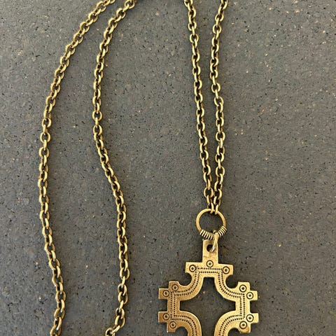 Smykket er laget i bronse og har de karakteristiske små anhengene nederst som klinger svakt ved bevegelse – ifølge gammel tradisjon skulle dette beskytte bæreren ved å skremme bort onde ånder.