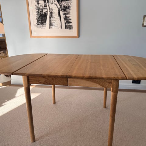 Bordet er 140 x 90 cm, og kan bli 250 cm i full lengde med begge klaffene dratt ut. Veldig praktisk bord!!