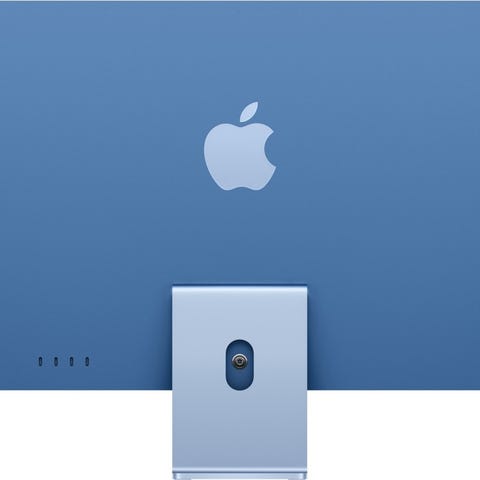 All‑in‑one skrivebordsmaskin med skjerm, innebygd fot og bakpanel i matchende farge.