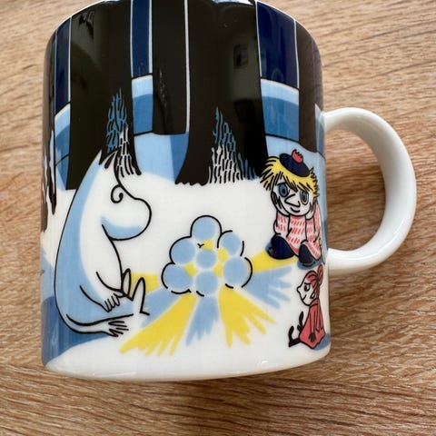 Arabia Mummikrus, vinterkoppen 2007. Koppen er i porselen og har illustrasjoner fra Mummidalen rundt hele yttersiden. Innsiden er hvit, og koppen har hank. Under koppen er den merket med Arabia Finland og Mummi-figur. Egner seg til varme og kalde drikker ved frokostbordet, på kjøkkenet eller som samleobjekt for Mummi-servise.