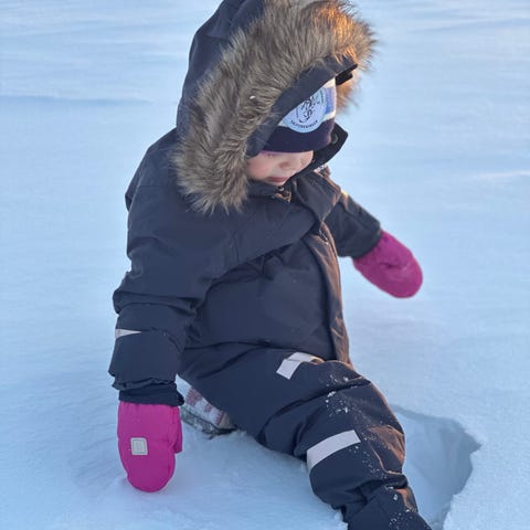 Minsten er allerede 80 cm og har vokst ut av denne. Kunne brukt 1 gang som på bildene. Følger med hette