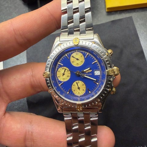 Selger en flott Breitling Chronomat B13050.1 med blå skive og to-tone stål/gull. Dette er en klassisk og ettertraktet modell med automatisk kronograf og Breitling Caliber 13 (Valjoux 7750), kjent for sin pålitelighet og kvalitet.