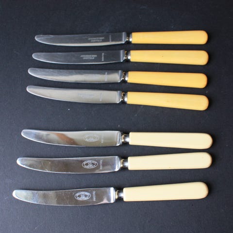 Vintage kniver i plast merket REKORD på knivbladet. To grønne, to gule og to rød.