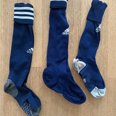 Selger 3 par røde fotballstrømper i str. 44 - ett par er ubrukt, ett par er brukt og i god stand, og ett par er hullete i hælene. Selges samlet.