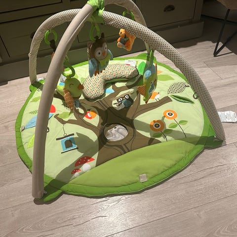Babygym fra Skip hop kjøpt på Jollyroom. Best i test, med fine farger og morsomme leker. Pent brukt av to små som har trivdes godt med denne. Av anmerkninger så har den ene fuglen mistet lyden sin og det er noen riper i speilet. Nypris 1095.