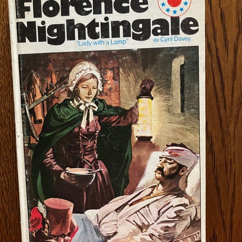 Bok i serien «I fokus» utgitt på Lunde forlag med tittel «Florence Nightingale». Biografisk fremstilling av Florence Nightingale og hennes arbeid. Heftet/pocketformat med illustrert forside. Tekst på norsk. På innsiden av permen finnes en personlig hilsen skrevet for hånd.