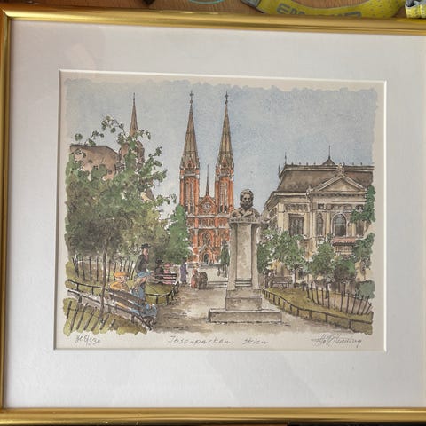 Litografi som viser Slottet i Oslo med trapp, søylefasade og rytterstatue i forgrunnen. Motiv i lyse farger med arkitektoniske detaljer. Signatur og årstall er påført nede på arket. Passer som veggbilde i stue, kontor eller gang. Trykket er montert med passepartout og ramme.