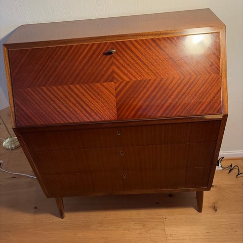 Fronten åpnes ned og danner en praktisk skriveflate. Innvendig har den en hylle for organisering av bøker, papirer eller dekor. Nederst er det tre romslige skuffer med originale håndtak. Møbelet står på elegante, koniske ben som gir det et lett og tidstypisk uttrykk.