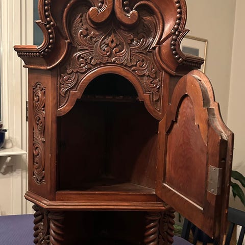 Hjørneskap i brunt tre med utskårne dekorative fronter. Skapet har flere seksjoner, inkludert skapdører med metallhåndtak og åpne hyller imellom. Utformet for plassering i hjørne, egnet til oppbevaring og utstilling av gjenstander i stue, spisestue eller gang. Mål fra hjørne er 57x57. Dybde 48. Høyde 2,01