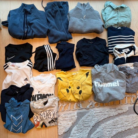 Pakke med flere gensere til gutt i størrelse 146 - 164. Pakken inneholder blant annet en mørkeblå Hummel-genser med stor logo, en mørkeblå Pokémon-genser med motiv på fronten, en mørk genser med jordklode-trykk og en mørk genser med «Copenhagen» tekst.