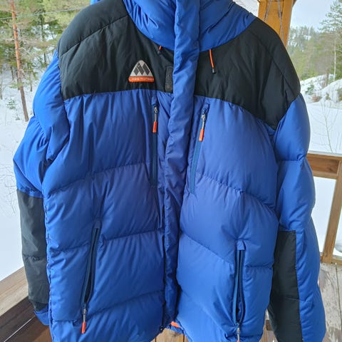 Fjällräven Expedition Down Jakke i størrelse S, farge blå. Jakken er en del av 1974 Expedition-serien og er laget med dunisolasjon for varme. Den har hette og flere lommer med klaff og knapp. Materialet er slitesterkt og designet for utendørs bruk.