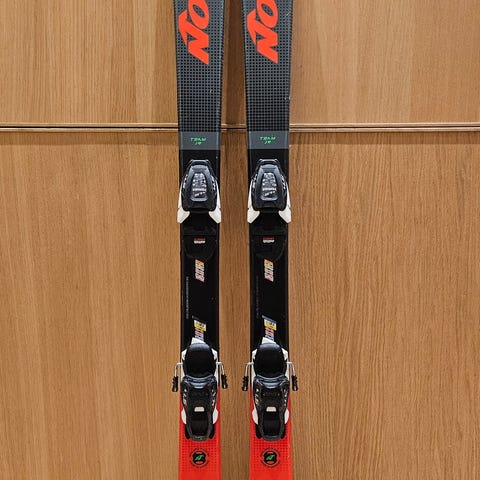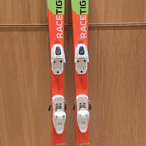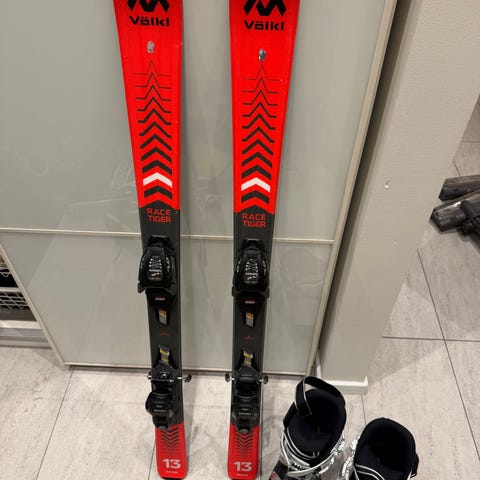 Völkl Racetiger GS alpinski i rød farge. Skiene har integrerte bindinger montert. Modellen er en GS (storslalåm) ski, egnet for preparerte bakker. Undersiden har helsvart såle. Passer til alpinkjøring i anlegg for løpere som ønsker en stivere ski med god kantgrep i høyere fart.