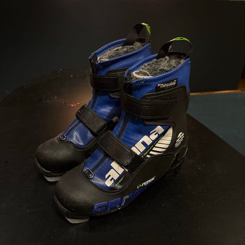 Alpina langrennsstøvler i svart og blå farge. Støvlene har høy ankelstøtte med borrelåsreim og snøring foran. Str 35
