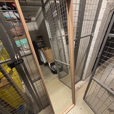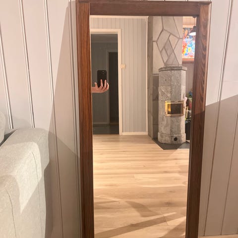 IKEA speil helfigur med treramme. Speilet har rektangulær form og er beregnet for bruk som helfigurspeil, for eksempel i gang, soverom eller garderobe.