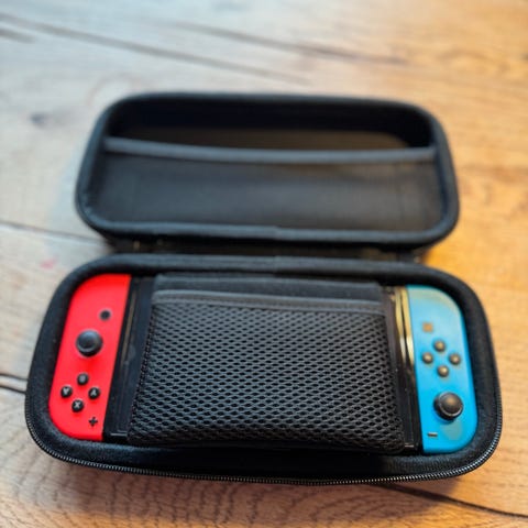 Nintendo Switch spillkonsoll med Joy-Con-kontrollere i fargene neon rød og neon blå. Konsollen leveres med dokkingstasjon for tilkobling til TV, Joy-Con-grep, strømadapter og kabler som vist på bildene. Det følger også med et hardt etui/bæreveske med innvendige stropper og nettinglomme for oppbevaring av konsoll og tilbehør.