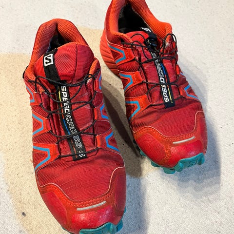Salomon Speedcross terrengløpesko i størrelse 40. Skoene er burgunder/røde med kontrastfarget yttersåle med grove knotter for godt grep på variert underlag. Overdelen har hurtigsnøring og forsterkninger rundt tå og sider. Egnet som løpesko eller tursko i terreng og på mykere underlag.