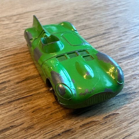 Matchbox Superfast Woosh-N-Push nr. 58 lekebil i metall. Modellen er produsert av Lesney Products & Co. Ltd i England, datert 1972. Bilen er gul med rødt interiør og svart «2»-dekal på bakdelen. Karosseriet er i støpt metall med plastdetaljer og fire hjul. Undersiden er merket med modellnavn, nummer og produksjonsland. Egner seg som samlerobjekt eller lekebil for barn som liker små metallbiler. 7,5 cm