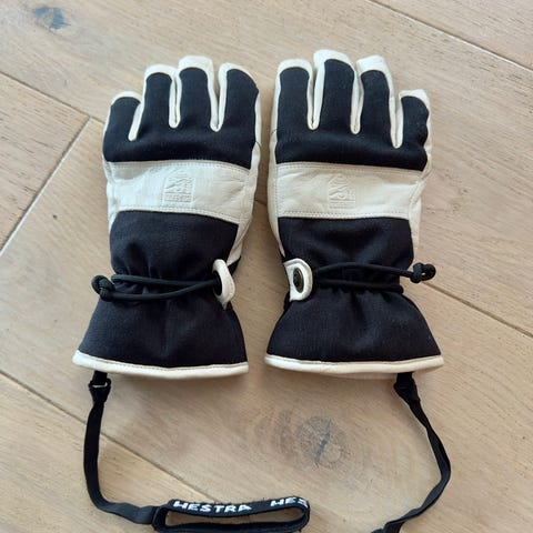 Hestra votter i str 9. Vottene er hvite og laget i skinn og stoff, med elastikk ved håndleddet for bedre passform. De har reim og feste mellom vottene for enkel sammenspenning. Egner seg til bruk på kalde dager og til ulike vinteraktiviteter.