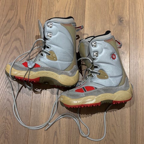 Støvlene har fire spenner foran og borrelåsreim øverst for justering og tilpasning.