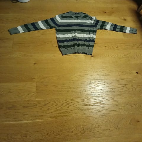 Genser for herre i størrelse M. Genseren er blå med horisontale hvite striper og har v-hals. Passer til hverdagsbruk og kan kombineres med både jeans og chinos.