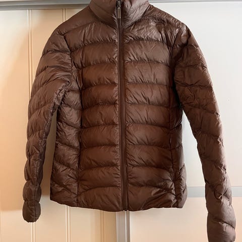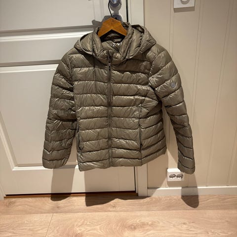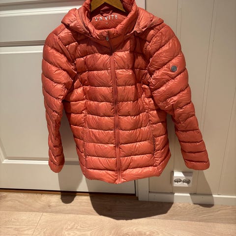 Va Vite dunjakke for dame i størrelse 42. Jakken er blå og vattert med dun. Den har hette, glidelåslukking foran og horisontale quiltede sømmer. Passer som lett ytterjakke i overgangssesonger eller milde vinterdager.