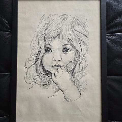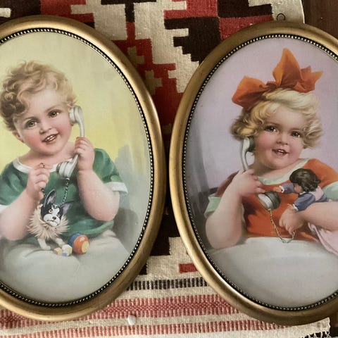 Barnebilder av båt og bil innrammet i trerammer
