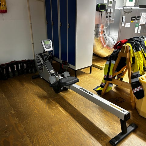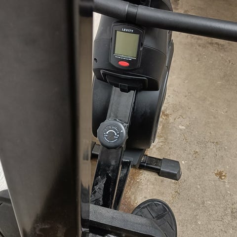 Romaskin med luftmotstand. Maskinen har justerbar motstandsenhet og fotstøtter, samt sete som beveger seg langs skinnen. Egnet til innendørs rotrening og kondisjonstrening. Merke og modell er ikke oppgitt.