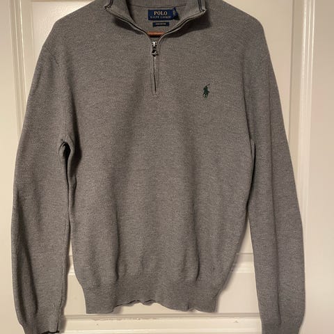 Ralph Lauren genser for herre i størrelse L. Genseren er beige og laget av bomull. Modellen har høy hals med kort glidelås (half-zip) og ribbestrikkede kanter nederst og på ermene. Diskret logo brodert på brystet. Passer til hverdagsbruk og kan kombineres med både jeans og chinos.