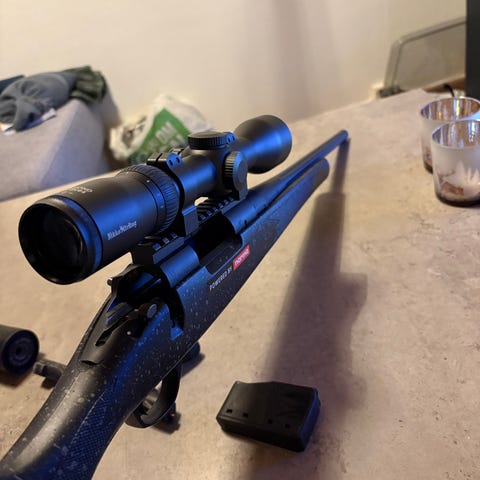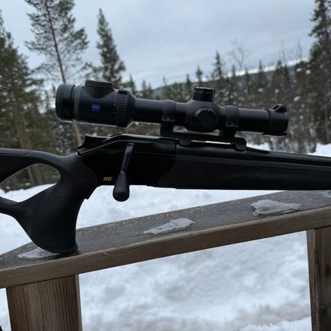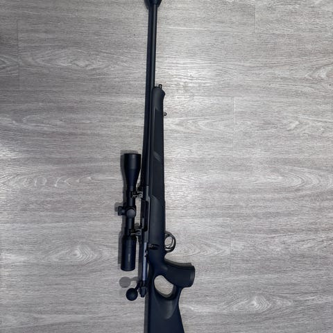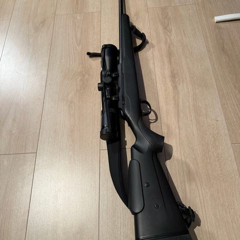 Denne riflen kjøpte jeg ny fra Jaktia i 2025, den har skutt i underkant 50 skudd. Det er påmontert en picatinny skinne fra Ragnar Hansen.