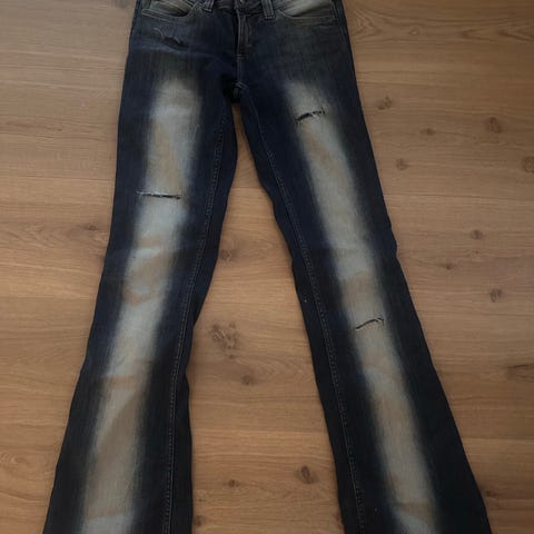 Tøff jeans uten stretch. Står str xl men synes den virker mindre enn xl så tok derfor bilde av midje med mål. Fotlengde målt fra skritt og ned er 80cm. Den har litt vidde i leggene