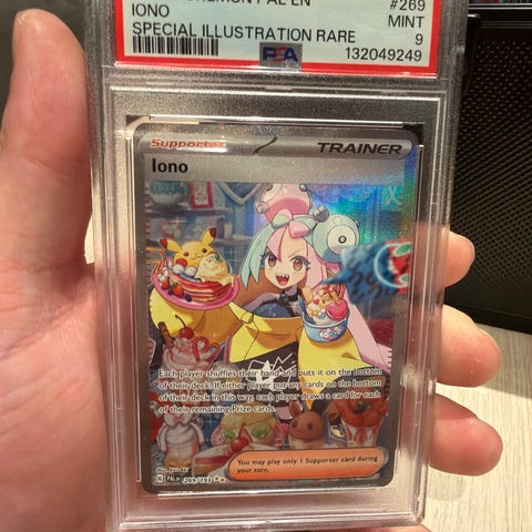 Selger et flott eksempel av Iono SIR fra paldea evolve settet i PSA9. Er dette en "sleeping" banger? Dette er et utrolig flott kort i mine øyne og med en "skjult" pikachu kan dette være et kort å ha i fremtiden🤩 har flere så velger å selge et for å fortsette galskapen med ascended heroes 😅