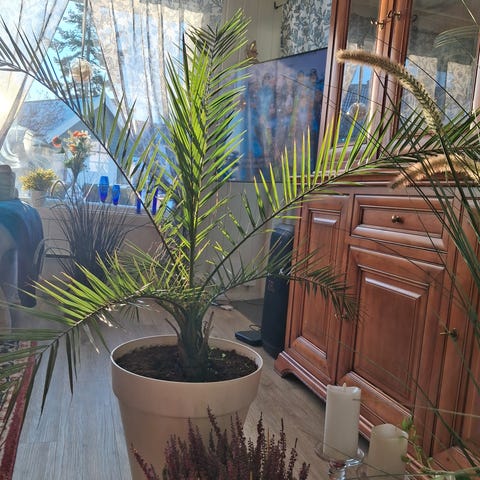Grønn frisk palme høyde-130 cm. med nye skudd, som inneplante i plastic potte(diameter 27 cm.)