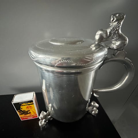 Seidel i tinn med løveføtter og hengslet lokk