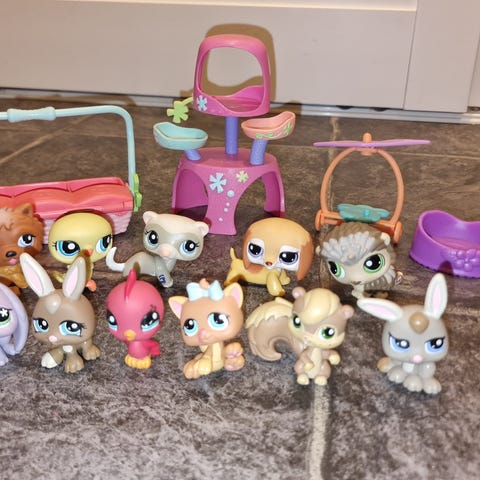 Littlest Pet Shop lekesett med buss og flere dyrefigurer. Settet inkluderer en hvit og rosa buss med sitteplasser til figurene, samt ulike små kjæledyrfigurer i plast. Lekesettet er egnet for rollelek og samling av Littlest Pet Shop-figurer.