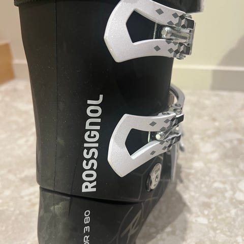 Pent brukte Rossignol alpin (slalåm) støvler til junior i størrelse 225 mm (sålelengde 268 mm). Modellen har fire justerbare spenner i metall og borrelås øverst for god tilpasning rundt leggen. Skallet er i svart plast med hvite detaljer. Passer til alpinski med kompatible bindinger.