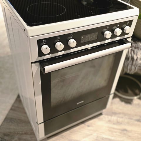 Electrolux induksjon komfyr. Komfyren har induksjonstopp med slette kokeplater og innebygd stekeovn med frontdør i glass. Betjeningspanel med dreieknapper og display foran.