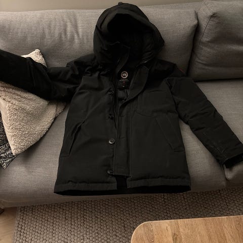 Canada Goose vinterjakke for herre i størrelse M. Jakken er svart og fylt med dun. Klassisk modell med Canada Goose-logo på ermet. Ytterjakke beregnet for vinterbruk, med hette og flere lommer. Passer som varm ytterjakke i kaldt vær.