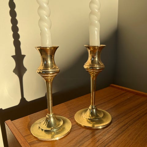 Selger to vintage lysestake i massiv messing. De er nesten like, men har noen ulikheter. Naturlig patina og bruksmerker kan forekomme. Den ene er 18cm høy, og den andre er 20cm høy. Selges samlet for 300kr, eller 180kr per stk.