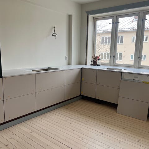 Kjøkkenfronter, benkeplaer, 2,92 og 1,8m med oppvaskum og armatur samt sokler.