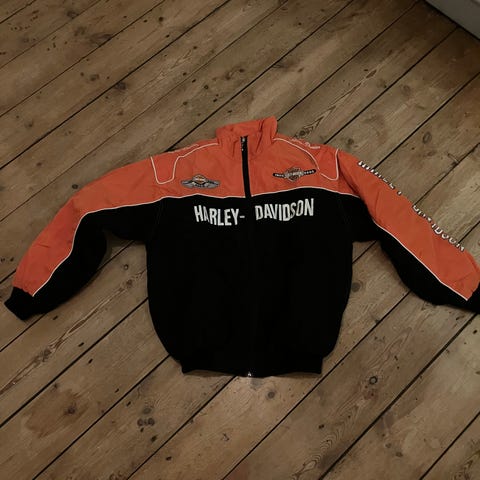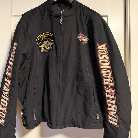 Harley-Davidson jakke for herre i størrelse XXL. Jakken er svart med oransje detaljer og har Harley-Davidson-logo og «Motorcycles»-trykk både foran og bak. Modellen har hette og glidelås i front. Egnet som fritidsjakke eller til bruk over annet tøy i kjøligere vær. Softshell jakken er pustende og vannavvisende .