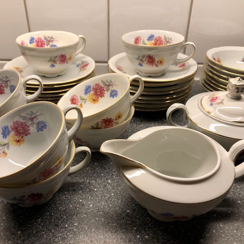 Komplett med 6 kopper og tilhørende tallerken. Det følger også med melkekanne og sukkerskål med lokk. Alt er meget pent brukt, men det finnes et lite hakk på den ene koppen som er vanskelig å se.