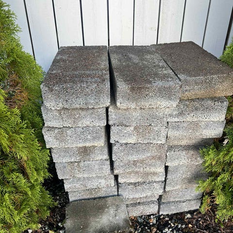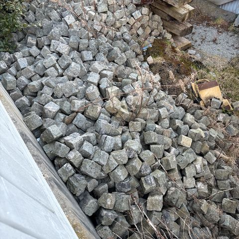 Selger brostein i størrelse 10cm x 10cm x 10cm. Steinen er plukket opp fra eksisterende uteområdet, og er ca 30m2.