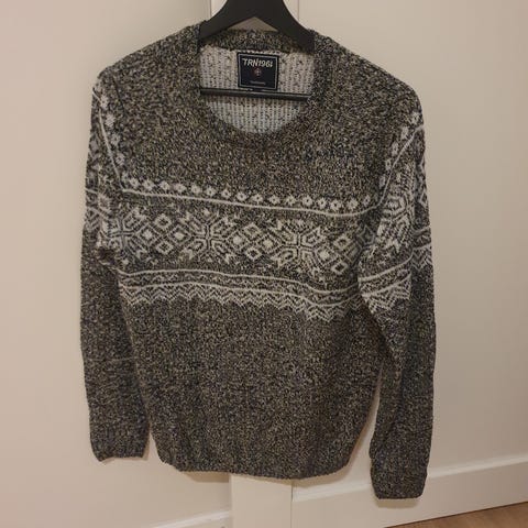 Bershka genser for herre i størrelse M. Genseren er svart med lyst, nordisk-inspirert mønster øverst. Den har rund hals og lange ermer. Passer til hverdagsbruk i kjøligere vær.