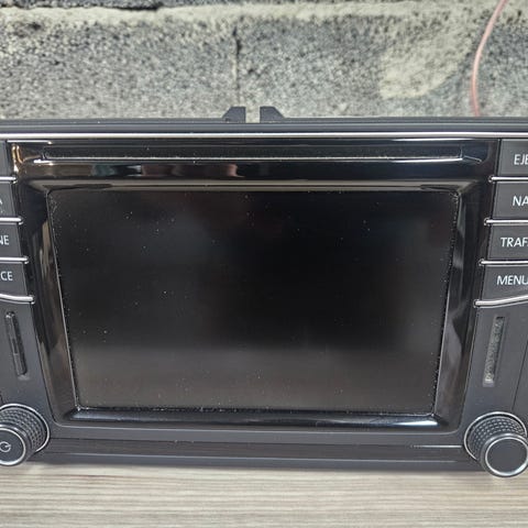 Dobbel-DIN bilradio med innebygd skjerm i svart utførelse. Enheten har frontpanel med display og betjeningsknapper på venstre side. Baksiden har flere tilkoblinger for strøm, høyttalere og eksterne enheter, samt medfølgende ledningsnett/kabler. Passer for montering i biler som støtter dobbel-DIN radio. Spesifikke funksjoner og kompatibilitet bør kontrolleres mot delenummer og bilmodell før montering.