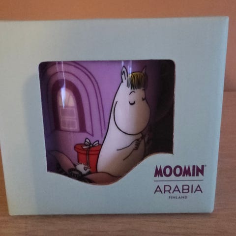 Arabia Moomin krus på 0,3 liter i grønn farge. Kruset er dekorert med Mummitrollet-motiv rundt hele koppen. Produsert i porselen og egnet som drikkekrus til varme og kalde drikker i hverdagsbruk. Leveres i original eske merket «Moomin Arabia».