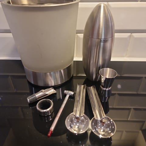 Barutstyr, shaker, isbøtte/ vinkjøler, målebeger