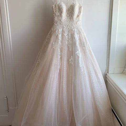 Kjolen er renset etter bruk og har ingen flekker. Kjolen er kun brukt en gang.