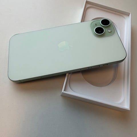 Telefonen er tatt ut av esken, men aldri vært skudd på! Beskyttelsen på skjermen er derfor fremdeles intakt.